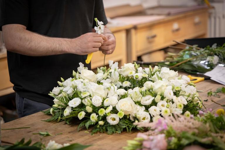 All of our wreaths for graves and funeral flowers are hand-crafted by local florists with the utmost care. They often combine white chrysanthemums, delicate lilies and roses with foliage to create a beautiful tribute, but they will always be guided by you. If you’d like a tribute crafted in a certain style or for a theme, they’ll be more than happy to help.