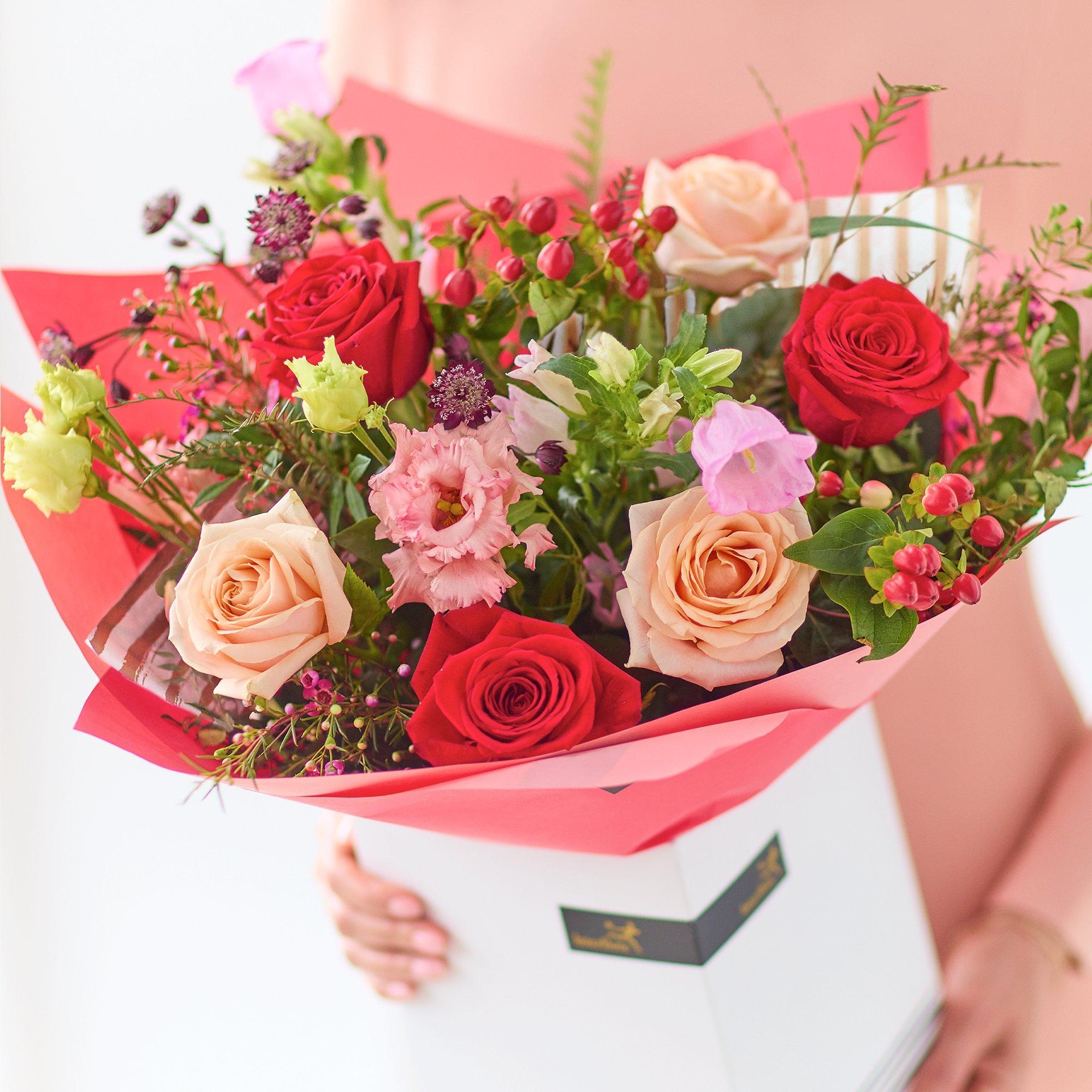 A irresistible mix of the finest, freshest romantic blooms, this bouquet is a knock out. Expect flowers in classic Valentine's colours including cerise, burgundy and soft pink.